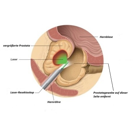 Laser-Vaporisation der Prostata besteht darin, überschüssiges Prostatagewebe mittels Vaporisation zu verdampfen. Die nach der Vaporisation verbleibenden Prostatareste müssen nicht mechanisch über die Harnröhre entfernt werden.